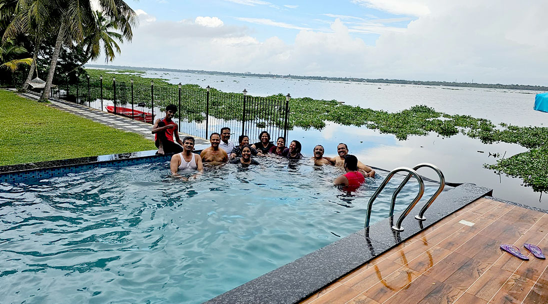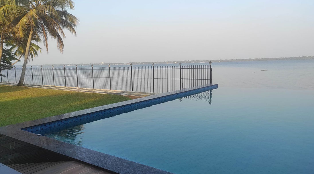 Immerse yourself in our stunning infinity pool, where water cascades over the edges, blurring the lines between pool and the panoramic Vembanad Lake beyond. This architectural marvel is designed to blend seamlessly with the sky and surrounding landscapes, offering a tranquil spot to unwind with views of the gazebo.